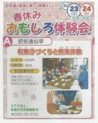 今年も「春休み おもしろ体験会」が開催されます。 肥前通仙亭は、和菓子づくりと煎茶体験です。 和菓子職人さんに和菓子作りを習い、おいしい煎茶のいれ方を学び、自分で作った和菓子で煎茶を楽しみます。 先着50名様限定です。電話等でのご予約はお受けしておりませんので、お早めにご来館ください。