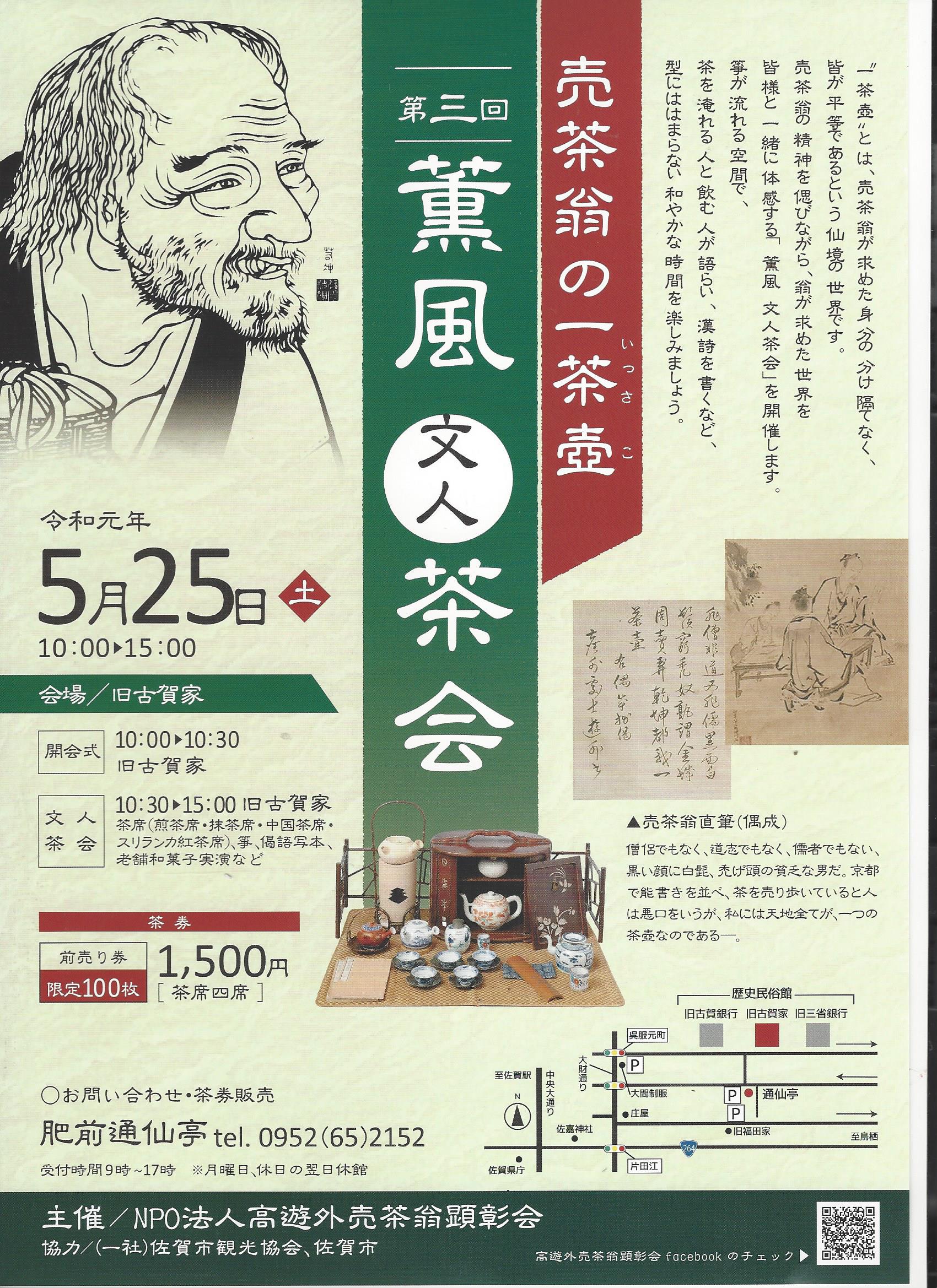 箏の音色が流れる中、ご自由に煎茶席/抹茶席/中国茶席/スリランカ紅茶席の4席をめぐり、和菓子職人による和菓子づくりの見学や、売茶翁の偈語2幅、の写本体験などをお楽しみください。売茶翁に習い、形にとらわれない新しい自由な茶会です。第3回売茶翁の一茶壺「薫風文人茶会」をお楽しみください。