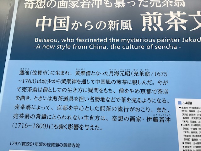 「―中国からの新風 煎茶文化―『奇想の画家若冲も慕った売茶翁』」と、伊藤若冲が描いた、売茶翁画など貴重な展示がされています。佐賀では見る機会の少ない、若冲の絵や、売茶翁の功績をご覧ください。