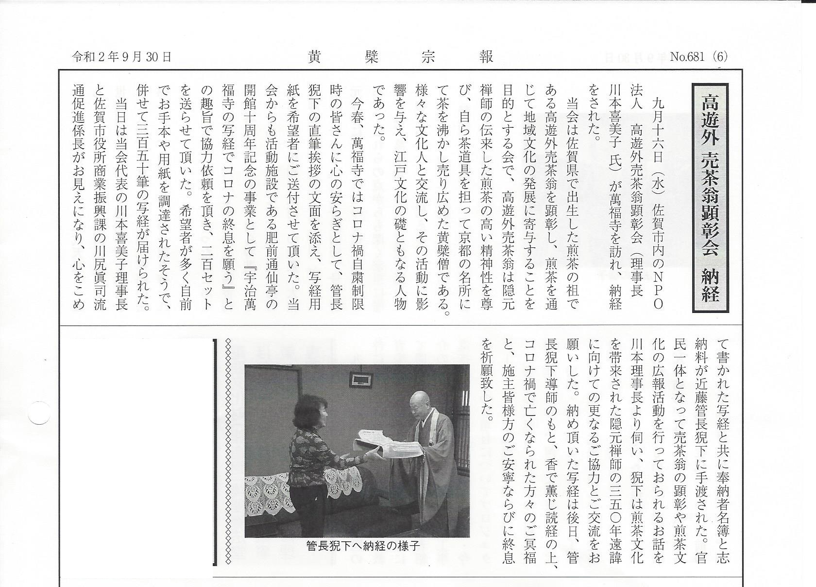 6月の肥前通仙亭開館10周年を記念して、コロナウイルスの終息を願い、萬福寺様より写経用紙一式を御贈りいただきました。 通仙亭ではご希望の方が多く、350名が参加されました。コロナが少しおさまった、9月16日に、宇治の萬福寺に奉納に伺いました。 萬福寺では、近藤管長猊下が直々に、面会いただきご丁寧にお迎え頂きました。 この度、黄檗宗報に大きく掲載頂きました。有り難うございました。 萬福寺では、2022年に、開祖隠元禅師350年大遠忌にあたり、準備が進められていました。