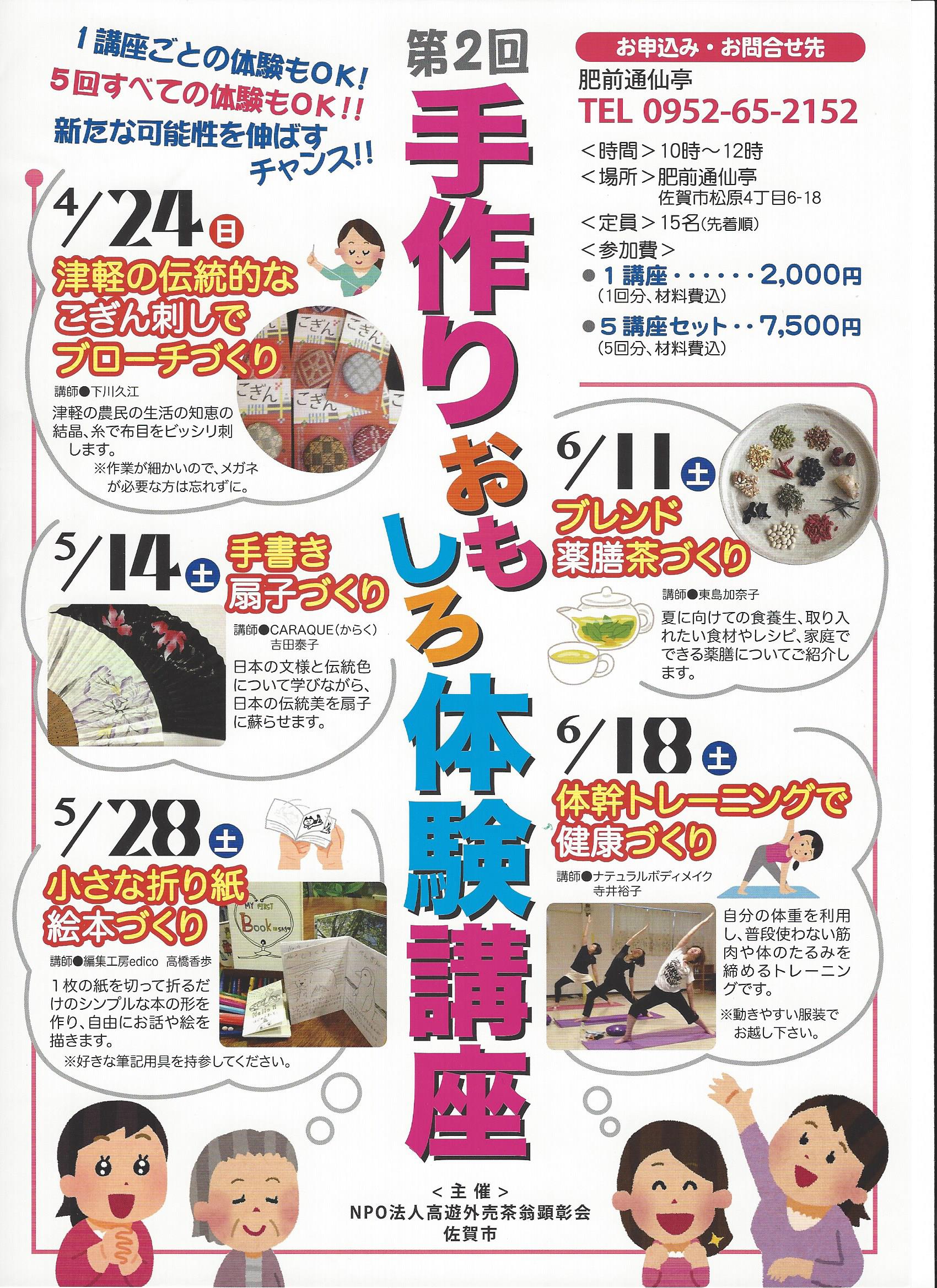 1講座ごとの体験、5回すべての体験いずれももOKですが、先着15名様となっておりますので、興味をお持ちの方はお早めにお申込みください。材料はこちらで準備しますので、お気軽にご参加ください。