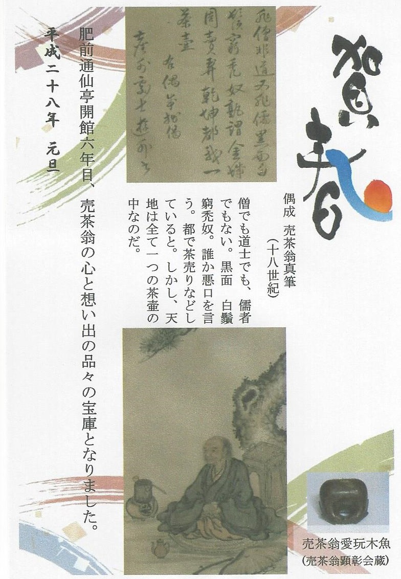 今年は肥前通仙亭開館 6年目を迎えます。 オープン以来、有志の方々、また売茶翁ゆかりの方々から売茶翁の真筆・遺品・資料等の数々を御寄贈いただき情報発信館として充実してまいりました。今年もどうぞお出かけくださいませ。