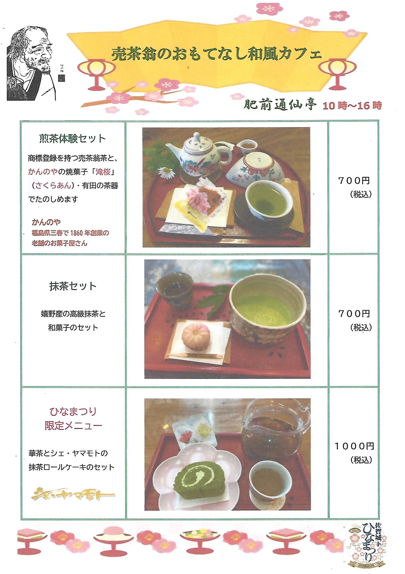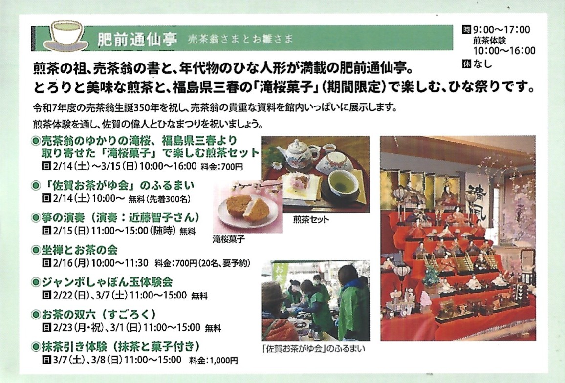 立春を過ぎ、今年も「佐賀城下ひなまつり」の季節がやってきました。今年は2月14日(土)からスタートです。 肥前通仙亭でも、数々のイベントを企画しています。(詳細は別添の資料をご覧ください) 売茶翁に関する貴重な資料の展示や、江戸時代末期の古いお雛さまをご覧いただけます。お煎茶体験セットは福島県三春より取り寄せた「滝桜菓子」でお楽しみいただけます。ぜひお出かけください。